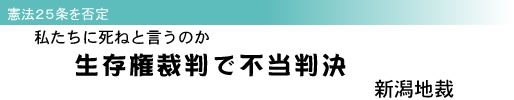 新潟地裁第1民事部は12月14日、生活保護の老齢加算の減額・廃止取り消しを求めていた生存権裁判で、原告の請求を棄却。厚生労働大臣の減額・廃止決定は合法との判決を言い渡しました。新潟市の山田ハルさん(93)、阿部長治さん(87)、新発田市の長谷川シズエさん(88)の3人が、新潟市および新発田市を訴えていました。(吉田松雄通信員)