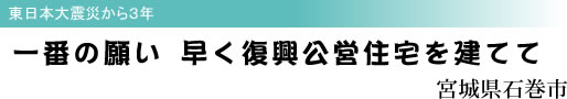 東日本大震災から3年が立ちます。いまなお復興のメドがたたず、被災者は厳しい生活を強いられています。2月24日、宮城県石巻市の南堺第7仮設団地で「生健会懇談会」が開かれ、全国生活と健康を守る会連合会の辻清二副会長や宮城県生活と健康を守る会連合会の山脇武治事務局長らが訪ねました。懇談会では、仮設住宅に住む被災者のみなさんから、大震災以来の生活ぶりや復興への思いが口々に語られました。
