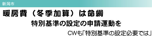 新潟市西区在住の片山百合子(68)さんは、冬季加算を年間1万6880円減額されました。昨年10月21日、節約のためにストーブを消した部屋に入った途端、膜下出血で麻痺した下肢が引きつり、転倒してろっ骨を6本骨折し入院しました。特別基準の支給を求めていた矢先でした。片山さんは、外出が困難です。体をほぐし、血圧をあげないために、電気こたつ、石油ストーブで暖を取っています。重度障害者加算がなく、要介護認度が低いために特別基準が設定されませんでした。